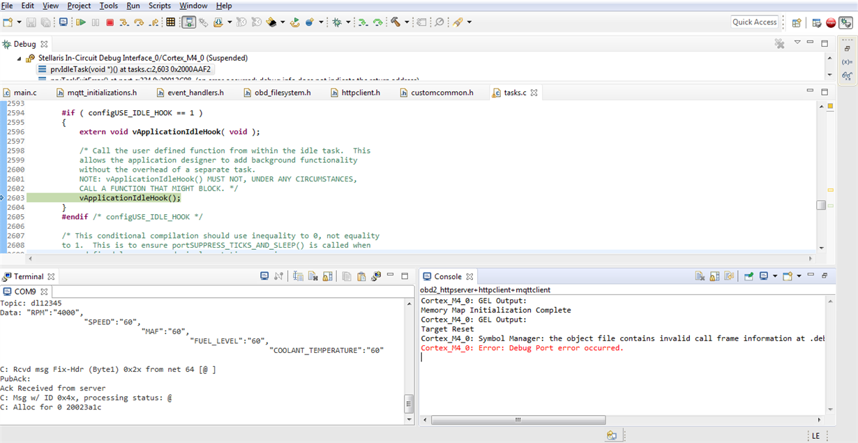 From few Days I'm getting "Debug Port error" while I debug my MQTT based application. When Debug Port error occurs , tasks.c file opens and points to the vApplicationIdleHook().